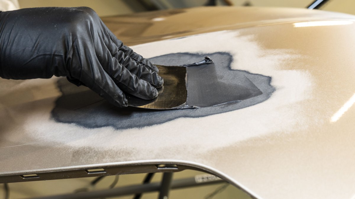 Après ponçage et dégraissage, le mastic retrouve sa couleur noire intense. Cela facilite l'inspection des éventuelles irrégularités restantes, pour garantir un résultat final parfait.