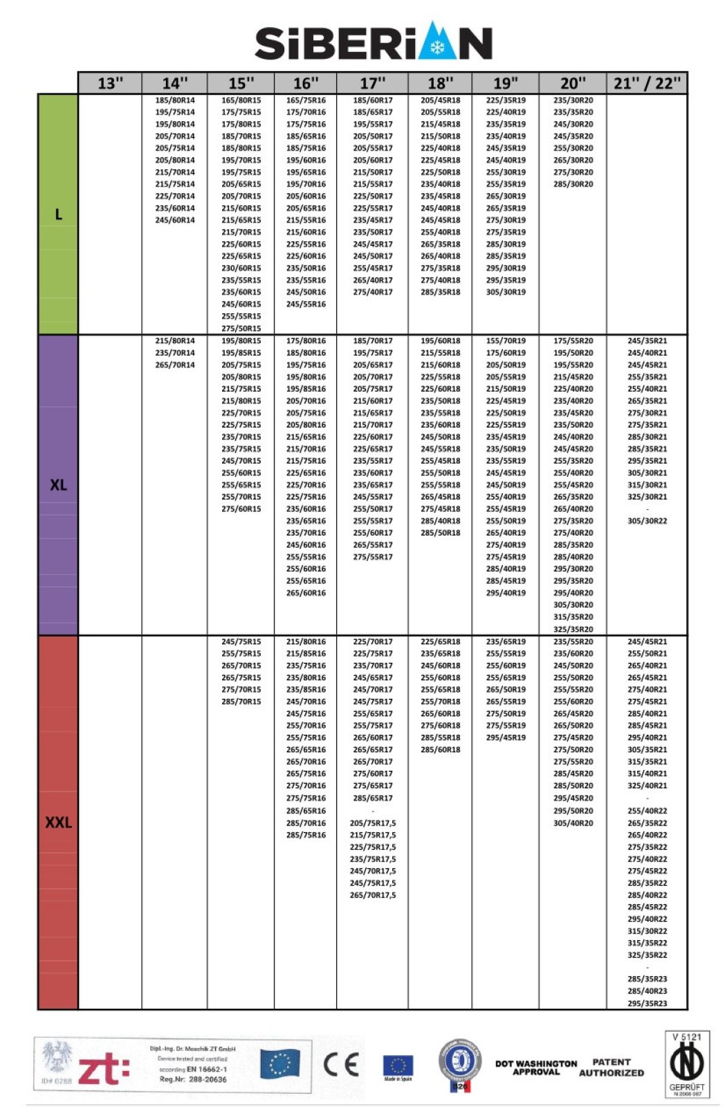 Met slechts vijf verschillende maten dekken de Siberian Autosocks 99% van de gangbare bandenmaten af. De XXL-variant is geschikt voor de volgende bandenmaten: