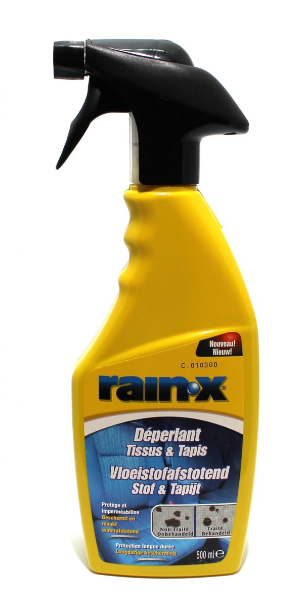 Rain-X Vloeistofafstotend Stof & Tapijt 500ml biedt een onzichtbare beschermlaag voor stoffen bekleding en tapijten in je auto. Deze laag stoot vloeistoffen af, waardoor morsingen niet in de stof trekken en vlekken worden voorkomen.