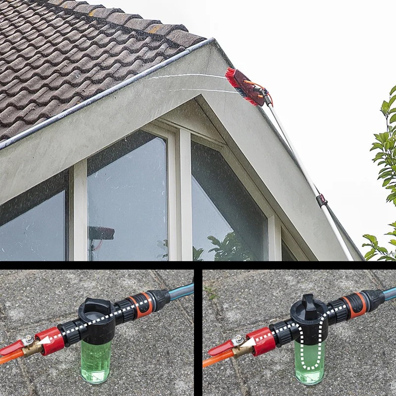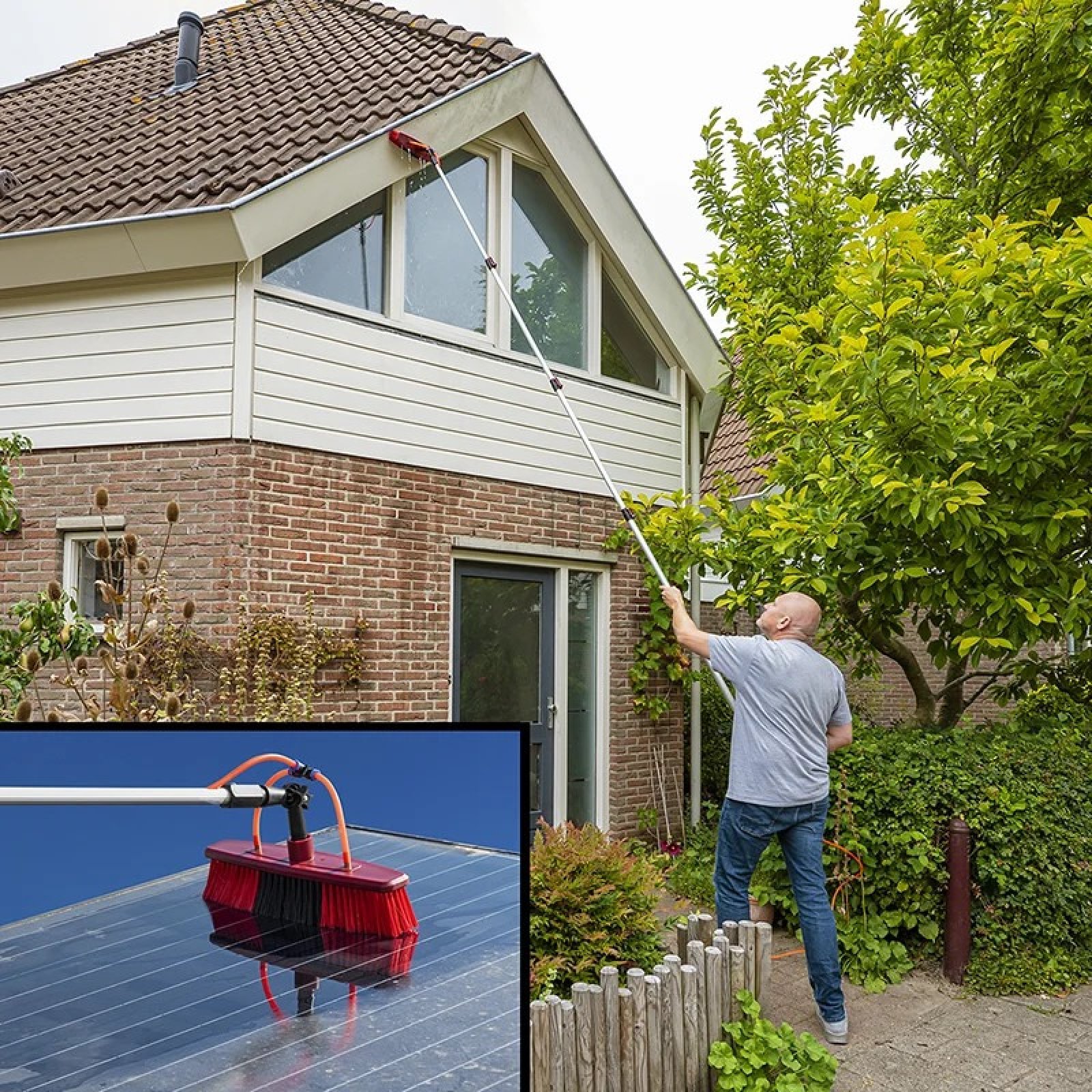 Dankzij de ingebouwde waterdoorvoer sluit je de wasborstel direct aan op je tuinslang waardoor je moeiteloos zonnepanelen op hoge hoogte kan reinigen. Dit zorgt voor een constante watertoevoer tijdens het reinigen, waardoor je sneller en effectiever werkt zonder steeds een emmer te hoeven vullen.