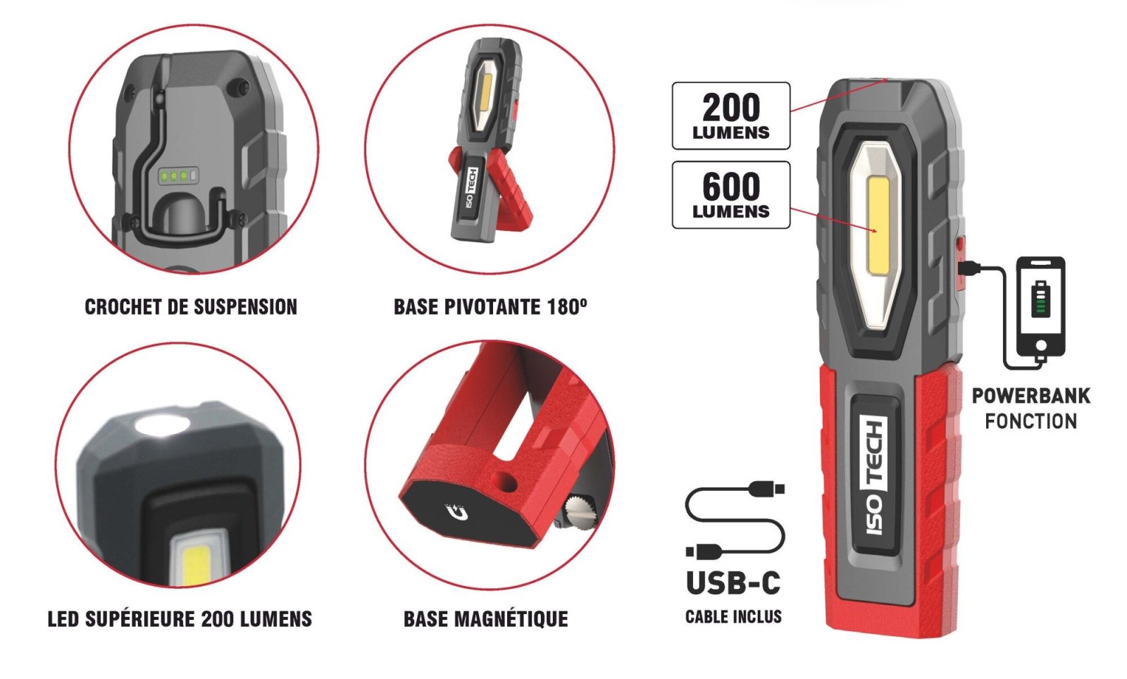 Met de ISOTECH IEQ4101 LED looplamp beschik je over een indrukwekkende lichtopbrengst van 600 lumen, ideaal voor diverse werkzaamheden. De extra koplamp met 200 lumen biedt aanvullende verlichting voor specifieke taken.