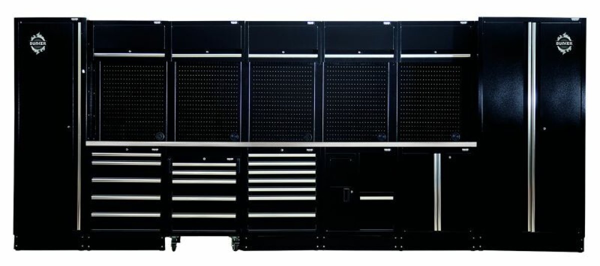 De BUNKER modulaire opbergcombinatie is vervaardigd uit hoogwaardig staal en afgewerkt met een duurzame matzwarte poedercoating. Deze stevige constructie garandeert een lange levensduur en is bestand tegen intensief gebruik in elke werkplaats.