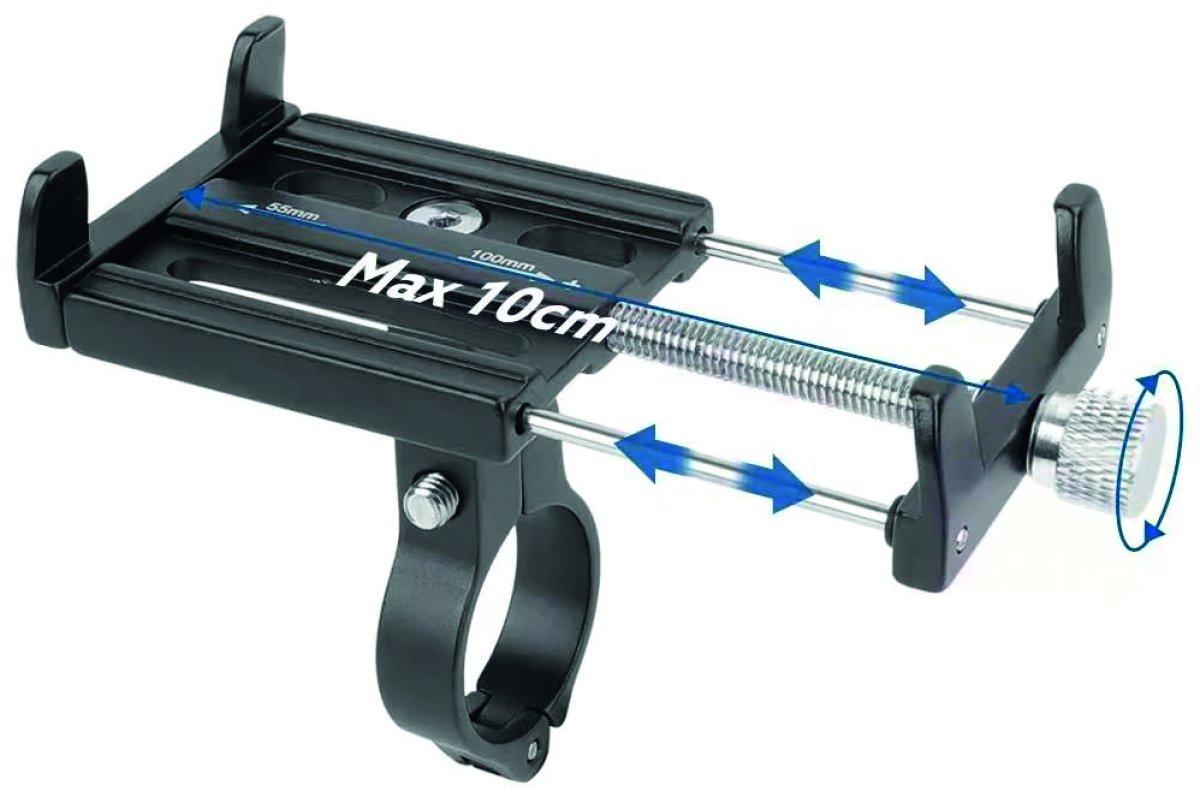 Met de 2GO universele smartphonehouder bevestig je je smartphone stevig op het stuur van je fiets. De houder beschikt over vier robuuste aluminium klemmen die je toestel veilig op zijn plaats houden, zelfs op ruwe terreinen. Door de zilveren knop aan de zijkant aan te draaien, zorg je voor een strakke en stabiele bevestiging.