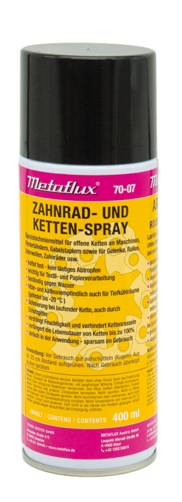 Metaflux 70-07 Ketting Spray is speciaal ontwikkeld voor het smeren van zwaar belaste, open kettingen en tandwielen. Dit maakt het product ideaal voor gebruik in: